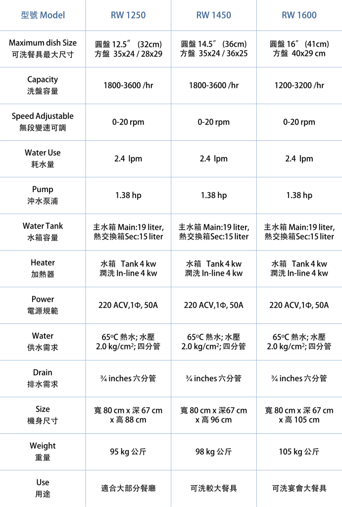 RW Dishwasher is a general purpose dishwasher, which can wash a variety of dinnerware for small and medium sized restaurant. Featuring: